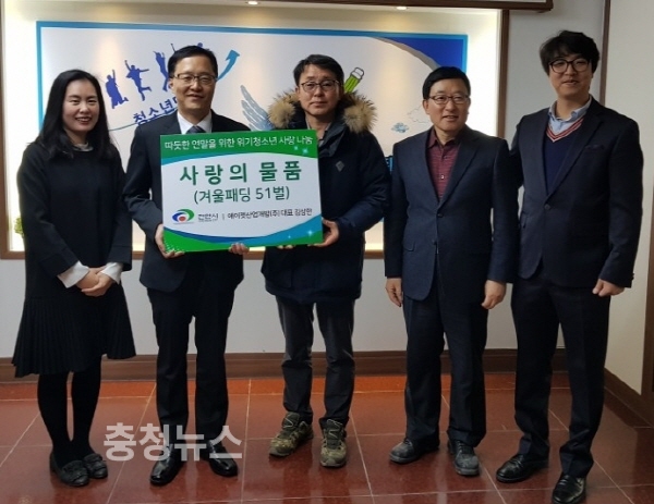천안청소년쉼터(대표 차승훈)는 22일 천안청소년쉼터에서 에이젯산업개발(주)(대표 김성한)로부터 겨울패딩 50벌을 지원받았다.
