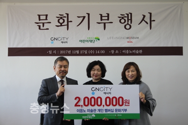 CNCITY에너지(대표이사 황인규)는 27일 대전이응노미술관에서 대전고암미술문화재단(대표이사 이지호)과 초록우산어린이재단 대전지역본부(본부장 박미애)에게 이응노 미술관 개인 멤버십 카드 200장을 전달했다.