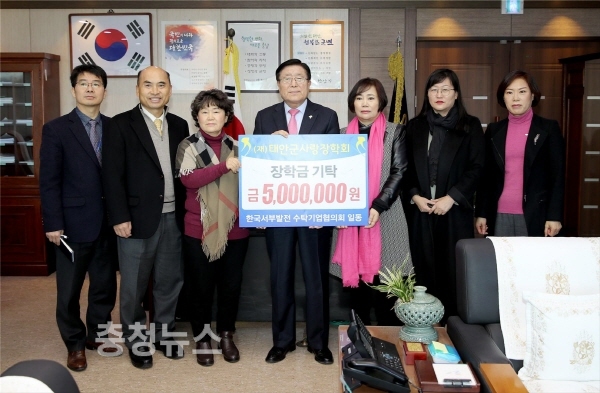 한국서부발전(사장대행 정영철) 수탁기업협의회 소속 중소기업들이 27일 태안군 사랑장학회에 500만원을 기탁해 공공기관과 협력중소기업과의 동반성장 선순환의 좋은 사례가 되었다.