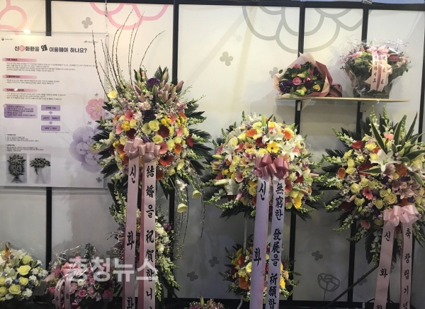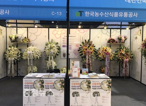 aT 화훼사업센터는 크기별·용도별 다양한 가격대의 「신화환 전시·홍보부스」를 운영한다. 기존의 국화 및 거베라 위주의 3단 대형 디자인에서 탈피해 장미, 스토크, 카네이션 등 다양한 계절 생화꽃을 사용한 신화환이 전시돼 있다.