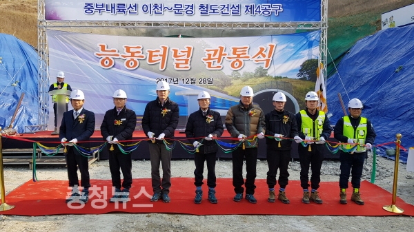 한국철도시설공단 충청본부(본부장 이동렬)는 중부내륙선(이천∼충주∼문경) 철도건설 제4공구 공사구간 중 가장 난(難)공사인 능동터널(3.365km)을 지난 28일 관통했다고 밝혔다.