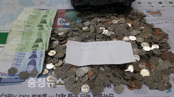 지난 27일 오전 논산시청에 방문해 돼지저금통을 건넨 어르신은 작년에 이어 ‘어려운 이웃님들을 위해 써주시면 감사하겠습니다’라는 메모지와 만원짜리, 천원짜리, 동전이 가득 든 돼지저금통을 내놓았다.