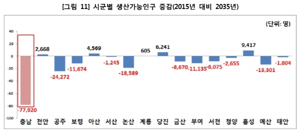 생산가능인구 역시 홍성, 당진, 아산, 천안, 계룡은 다소 증가하는 반면, 그외 시군은 모두 감소해 2035년 태안, 예산 등 6개 군의 생산가능인구비중이 40%대로 줄어드는 것으로 예상됐다.