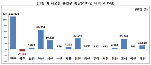 추계 결과에 따르면 2015년 대비 2035년 공주를 제외한 모든 시군에서 인구가 증가할 것으로 보이며, 특히 홍성은 1.4배나 늘어 12만 8000명 규모로 성장할 것으로 예상된다.