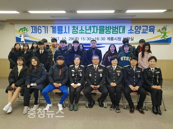 충남 계룡시(시장 최홍묵)는 지난달 29일 시청 상황실에서 학생 30여 명이 참석한 가운데 ‘제6기 계룡시 청소년자율방범대’를 구성하고 소양교육을 진행했다.