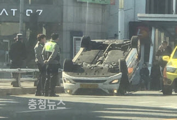 목격자 A씨는 “반대편에서 오던 택시가 난간에 강하게 부딪혀 순식간에 차가 뒤집어졌다”며 “다행히 차량이 인도를 넘지 않아 부상을 입은 보행자는 보이지 않았다”고 당시 상황을 설명했다.