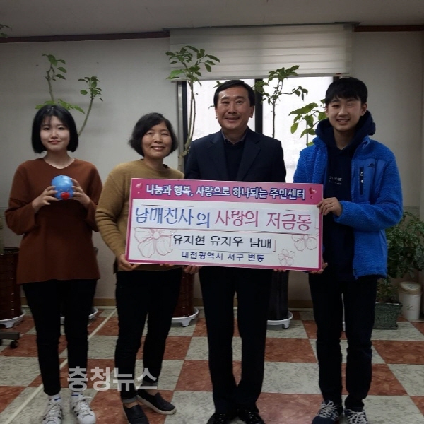 대전 서구 변동에 거주하는 유**(12), 유**(15)남매가 일 년 동안 폐지와 공병을 팔아 꽉 채운 돼지저금통을 들고 8일 변동 주민센터에 찾아왔다.