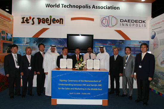 박성효 대전시장과 함께 4월14~16일까지 3일간 아랍에미레이트 두바이에서 열리고 있는 제5회 WTA 테크노마트 행사에 참가한 기업중 (주)삼진JMC (대표 정태희)가 두바이 EWI(East West International Trading Co Ltd)사와 900만불 수출에 관한 MOU(양해각서)를 체결 했다.