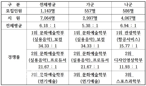 나군에서는 관광학부(항공서비스) 일반학생전형이 13명 모집에 205명이 지원해 15.77:1, 디자인영상학부 11.93:1, 스포츠과학부 9.78:1 순으로 경쟁률이 높았다.