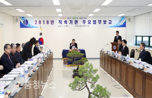 대전교육과학연구원(원장 윤국진)은 11일 교육과학연구원에서 4개 직속기관(교육과학연구원, 교육연수원, 교육정보원, 유아교육진흥원)이 2018학년도 주요업무 계획을 보고하고, 업무 협의 및 소통의 시간을 마련했다.