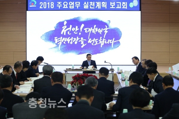 충남 천안시는 ‘더 큰 미래, 더 행복한 천안’ 구현을 위해 15일 시청 대회의실에서 5급 이상 간부, 6급 이하 직원 등 150여명이 참석한 가운데‘2018년 주요업무실천계획 보고회’를 개최했다.