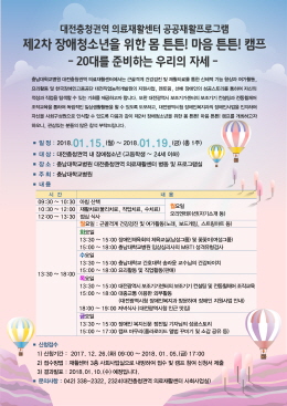 제2차 장애청소년을 위한 캠프는 20대를 준비하는 장애청소년을 응원하는 대전충청권역 의료재활센터의 대표적인 사회복귀지원 프로그램으로 근골격계 건강검진, 재활치료를 통한 신체적 기능 향상과 다양한 체험활동,