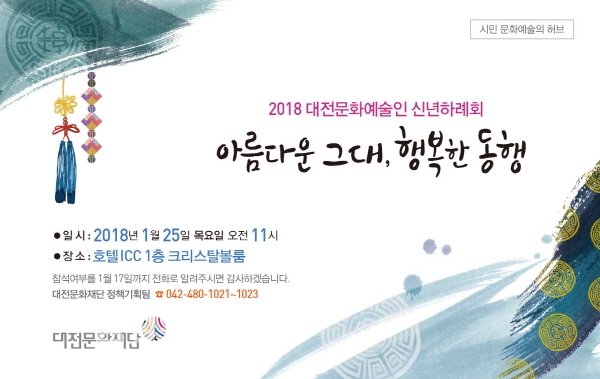 대전문화재단(대표이사 이춘아)은 2018년 대전문화예술인 신년하례회 '아름다운 그대, 행복한 동행' 을 오는 25일 대전 유성구 도룡동 호텔ICC 1층 크리스탈볼룸에서 개최한다.