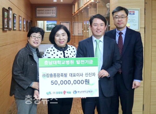 충남대학교병원 송민호 원장은 ㈜장충동왕족발 신신자 대표이사로 부터 충남대학교병원 발전기금 5천만원을 기부 받았다.