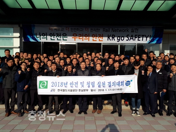 한국철도시설공단 호남본부(본부장 전희광)는 지난 17일 호남본부 직원들과 협력사 직원 등 약 120여 명이 참석한 가운데 ‘2018년 안전·청렴 실천 결의대회’를 개최하고, 3년 연속 무재해·무사고를 다짐했다고 밝혔다.