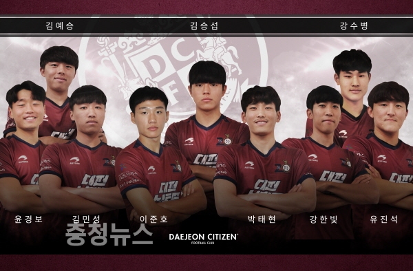 대전시티즌이 고교, 대학무대에서 활약한 신인선수 9인을 영입했다. 공격수 김승섭, 강한빛, 유진석, 이준호 미드필더 김민성 수비수 강수병, 김예성, 박태현, 윤경보가 그 주인공이다.