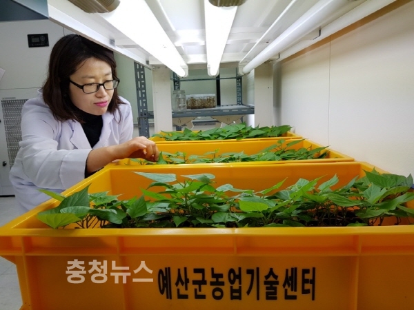 충남 예산군농업기술센터는 센터 내 실증시험 유리온실에서 조직배양 건전 고구마 묘 재배 생산으로 바쁜 하루를 보내고 있다.