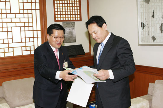 YESS-5월의 눈꽃축제 홍보차 문화체육관광부를 방문한 진동규 유성구청장이 유인촌장관을 예방하고 금년부터 새롭게 선보이는 유성대표축제 준비상황을 설명하고 있다