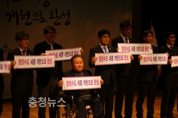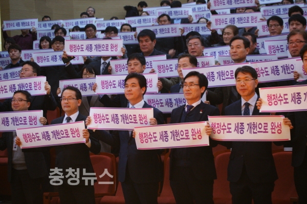 이날 참석자들은 결의대회에 앞서 충청권상생협력기획단 이전 현판 제막식을 가졌다. 이들은 ‘행정수도 세종, 개헌으로 완성’이라는 액자를 부착하며 행정수도 완성을 염원했다.