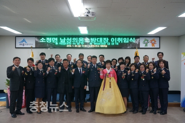 세종시(시장 이춘희) 조치원소방서는 26일 소정면사무소에서 강준현 정무부시장과 소방공무원, 의용소방대원 등 90여명이 참석한 가운데 소정면 남성의용소방대장 이·취임식을 가졌다.