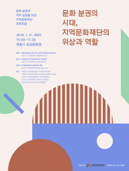 포럼 진행은 김보성 대전문화재단 문화기획실장을 좌장으로 문화예술관련 법과 제도 영역의 문제점과 개선방안(서영수 부산문화재단 생활문화본부장), 문화분권과 지역문화재단의 사업전환 방향(손동혁 인천문화재단 문화교육팀장),