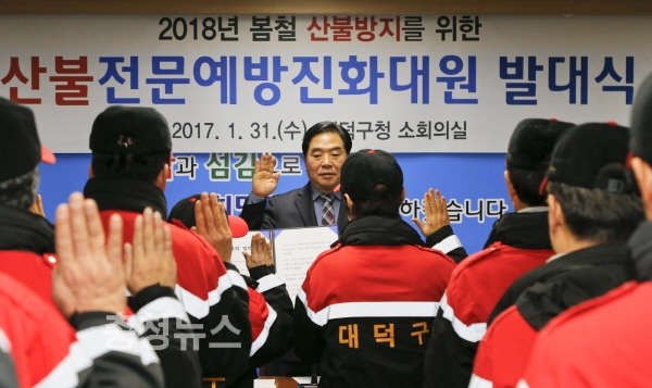 대전 대덕구(구청장 박수범)는 31일 구청 소회의실에서 봄철 본격적인 건조기를 맞아 산림피해의 경각심을 고취하고 산불방지의 결의를 다지기 위해 산불 전문예방 진화대원 등이 모인 가운데 봄철 산불 전문예방 진화대 발대식을 가졌다.