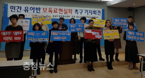 30일 조용자 충남 민간어린이집협회 회장을 비롯한 어린이집 원장들은 충남교육청 브리핑룸에서 보육료현실화와 차액보육료 지원을 촉구하는 기자회견을 가졌다.