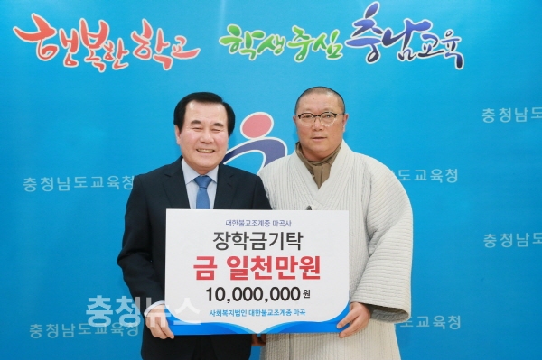 충남교육청(교육감 김지철)은 1일 대한불교조계종 마곡사(주지 원경 스님)로부터 장학금 1000만 원을 전달받았다.