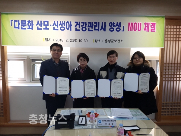 충남 홍성군보건소는 지난 2일 다문화 이주여성을 위한 ‘다문화 산모·신생아 건강관리사 양성 사업’을 위해 산모 신생아 건강관리사 교육 및 건강관리 제공기관인 미소맘, 해피케어, 다문화가족지원센터 총 3개 기관과 MOU를 체결했다.