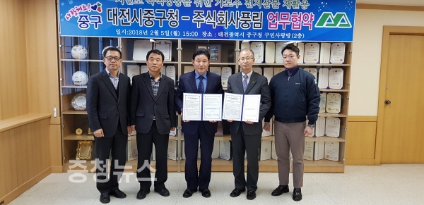 대전 중구(구청장 박용갑)는 5일 ㈜풍림(대표이사 전경옥)과 저탄소 녹색성장 제고를 위한 가로수 전지산물 재활용 업무협약을 체결했다.