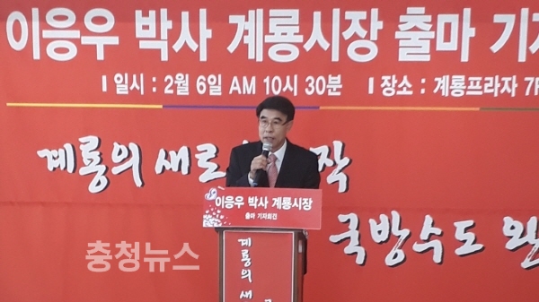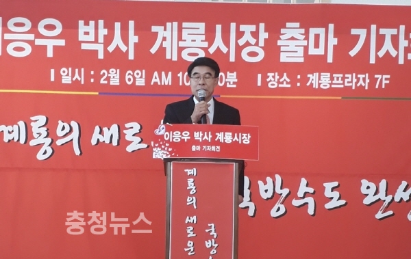 자유한국당 이응우 충남도당 부위원장은 6일 오전 ‘계룡의 새로운 시작 국방수도 완성!’이라는 슬로건을 내걸고 군 출신 인사로는 처음으로 계룡시장 출마 기자회견을 열었다.