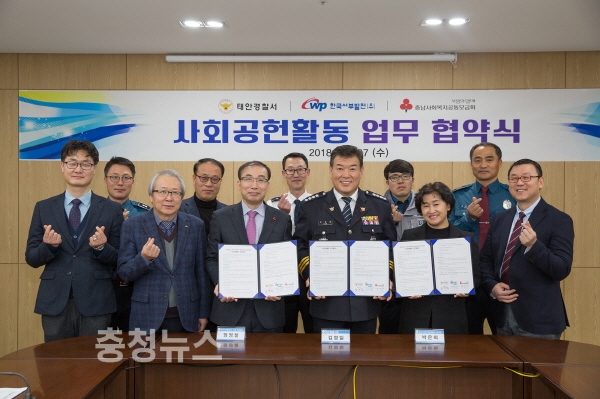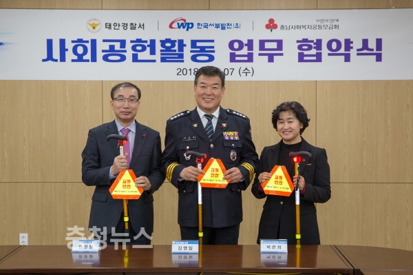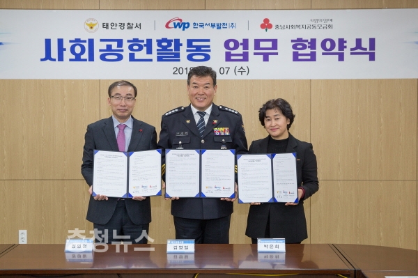 한국서부발전(사장직무대행 정영철)은 7일 태안경찰서 회의실에서 태안경찰서, 충남사회복지공동모금회와 함께 안전한 태안군을 만들기 위한 사회공헌활동 협약을 체결했다고 밝혔다.