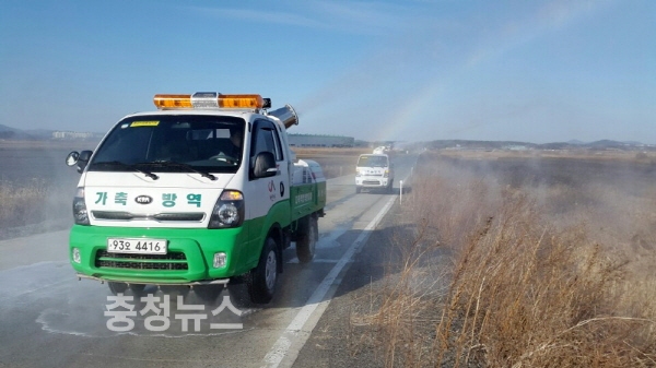 특히 일제소독의 날마다 광역살포기를 동원해 철새도래지 도로 주변과 풍전저수지, 잠홍저수지, 축사 외부, 야산지역 등을 소독하고 있다.