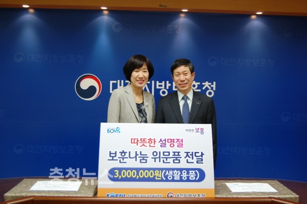 한국철도공사 대전충남본부(본부장 양운학)은 8일 대전지방보훈청(청장 강윤진)에 설명절 따뜻한 보훈나눔 위문품(300만원 상당)을 전달했다.