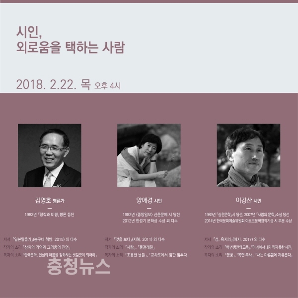 이번 콘서트는‘시인, 외로움을 택하는 사람’을 주제로 김영호 평론가, 양애경 시인과 이강산 시인이 각자의 활동분야에서 느꼈던 가치있는 외로움에 대해 이야기한다.