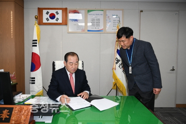 황선봉 군수가 ‘예산지명 1100주년 기념 및 미래천년 희망사업 2018년 종합추진계획’을 결재하고 있다