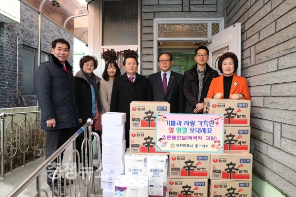 동구의회 의원들은 12일 장애인 복지시설인 가양2동 소재는 뷰티플마인드, 홍도동 기쁜우리주간 보호센터, 용전동 해맑은 아동보호센터를 차례로 방문 생활용품을 전달하고, 매서운 한파에 건강관리를 당부하면서 시설 관계자들을 격려하고 애로사항을 청취했다.