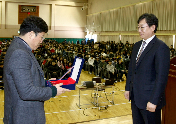 김경훈 대전시의회 의장은 13일 중구 목동초등학교 대강당에서 오명세 운영위원회 위원장으로부터 교육환경 개선과 지역발전에 이바지한 공로로 감사패를 받았다.
