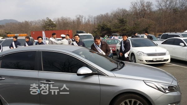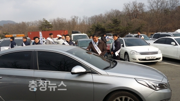 한국도로공사 대전충남본부 박상활 본부장이 교통안전용품을 고객에게 배포하고 있다.