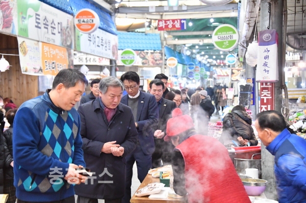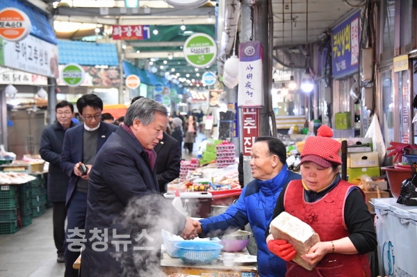 이용우 부여군수가 설 명절을 맞아 14일 중앙시장을 방문하고 상인들을 격려하는 시간을 가졌다.