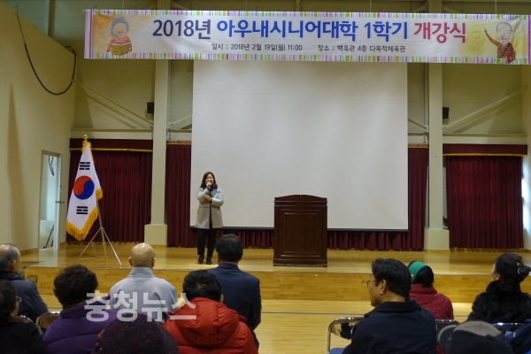 아우내은빛복지관(관장 이수경)은 지난 19일 오전 백옥관 4층 다목적체육관에서 어르신들의 활기찬 여가문화 활성화를 위한 2018년도 1학기 아우내시니어대학 개강식을 개최했다.