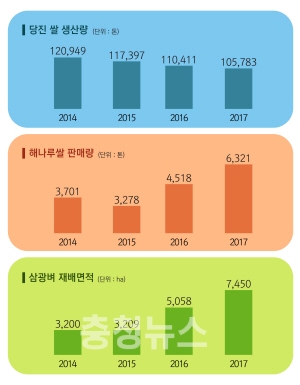 2014년과 비교해 3년이 지난 2017년 당진지역의 쌀 생산량은 감소한 반면 지역 브랜드 쌀인 해나루쌀의 판매량은 증가한 것으로 나타났다.