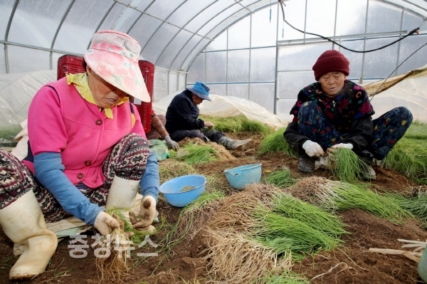 원북면 반계리 주민들이 봄의 전령사로 손꼽히는 태안군의 대표 특산물 달래를 수확하고 있다.