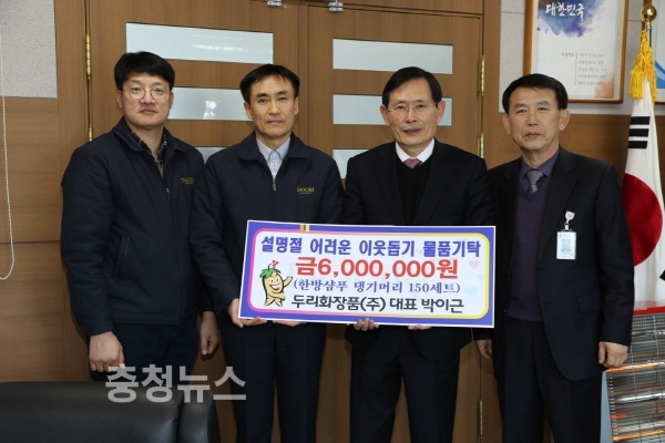 한편, 두리화장품은 이번 금산군 설맞이 물품 기탁 외에도 매년 사회공헌 활동을 적극적으로 펼치고 있다. 주요 활동으로는 애견샴푸 알프레독 브랜드 기부와 메르스 예방 손세정제 10만개 기부 등이 있다.