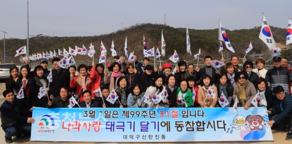 대전 대덕구 신탄진동(동장 강동구)이 제99주년 3․1절을 맞아 선열들의 나라사랑 정신을 기리고, 태극기의 소중함을 일깨우기 위해 동 자생단체 회원 100여명이 모여 대청대교를 태극기대교로 만들었다.
