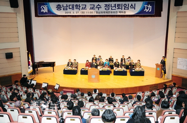 충남대는 27일 정심화국제문화회관 백마홀에서 김미연, 최수경, 조대우, 김건중, 원종호, 이만호, 이희익, 김재홍, 권광일, 김영신, 박순희, 김현수, 한상훈 교수에 대한 정년퇴임식을 개최했다.