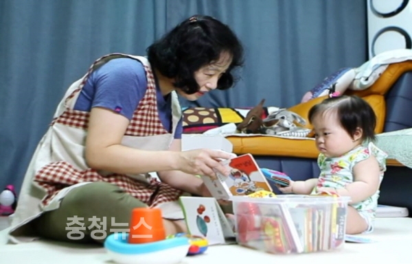 천안시 수호천사 긴급출동 사업으로 아이돌보미인 수호천사가 아이를 돌보고 있는 모습