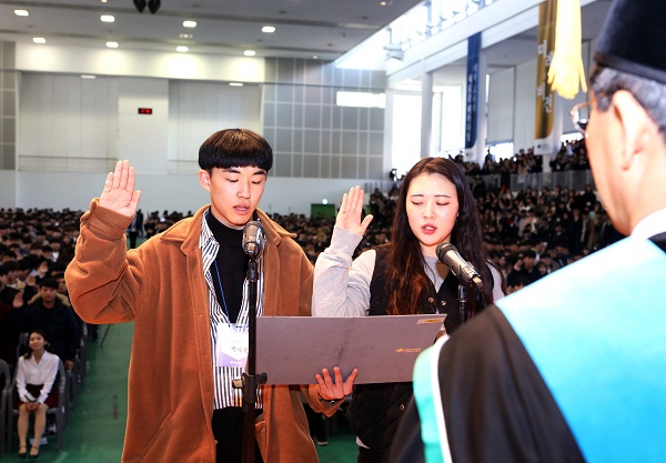 입학식에는 군사학과 박상민(21)‧천송희(20, 여)학생이 신입생 대표로 나서 입학식 선서를 했으며, 성적우수장학생으로 선정된 한의예과 권용문(20)학생이 장학증서를 전달받았다.