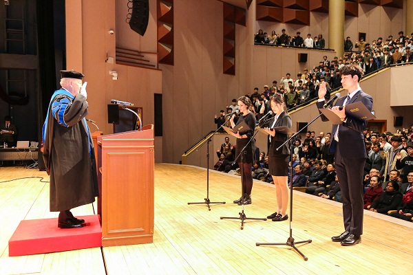 입학식에서 박 순(호텔관광경영학과), 뤄샤오링(LUO XIAOLING 중국·여, 글로벌비즈니스학과), 까밀리아 르플랑(Camilia Myriam Camelia Leplang 프랑스·여 솔브릿지국제경영대학) 학생이 신입생 대표로 선서를 했다.