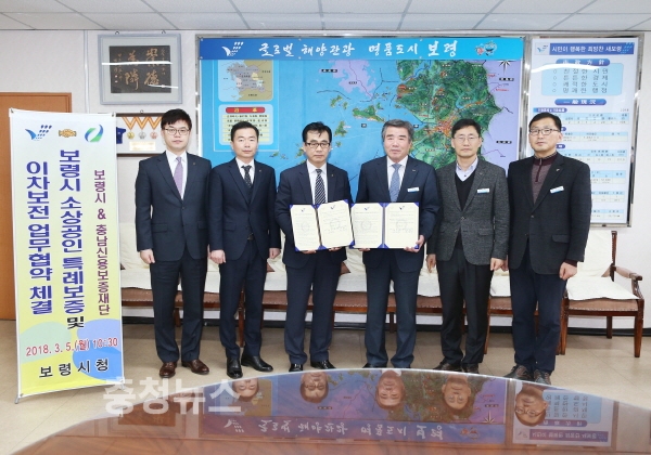 충남 보령시는 5일 오전 시장실에서 김동일 시장과 정철수 충남신용보증재단 이사장 등 관계자가 참석한 가운데 소상공인 특례보증 및 이차보전 지원업무 위탁 협약을 체결했다.